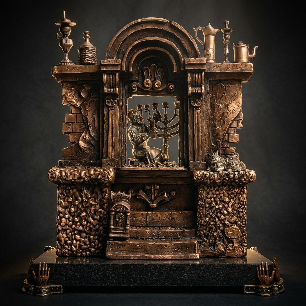 БЕЦАЛЕЛЬ ИЗ МЕСТЕЧКА (ханукия) Бронза, cеребро, литье, патинирование, камень. Высота – 30 см. 2008