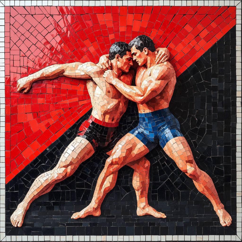 100 х 100 см. Витражное стекло, масло, алюминий Мозаичное панно «Борьба к победе» — экспрессивная работа, воспевающая силу духа и волю к победе. В центре композиции — два борца в разгар схватки. Их фигуры, исполненные мощной пластики, передают напряжение момента: мускулы напряжены, позы динамичны, движения стремительны и выверены. Через язык тела художник раскрывает не просто физическую схватку, но и внутреннюю борьбу — столкновение характеров, стратегий, устремлений.