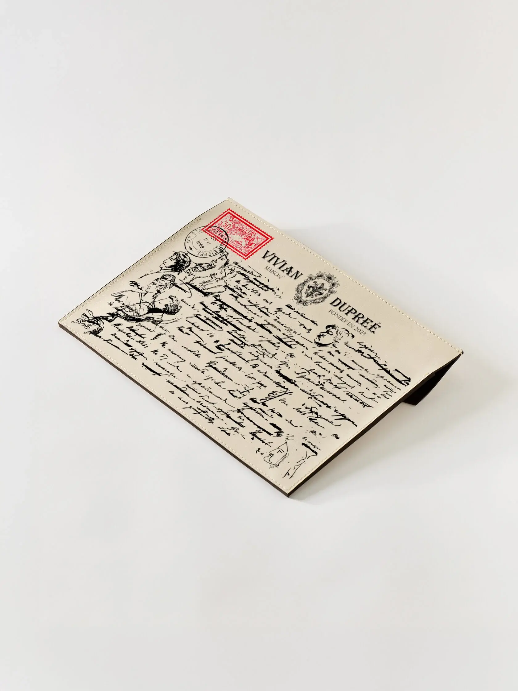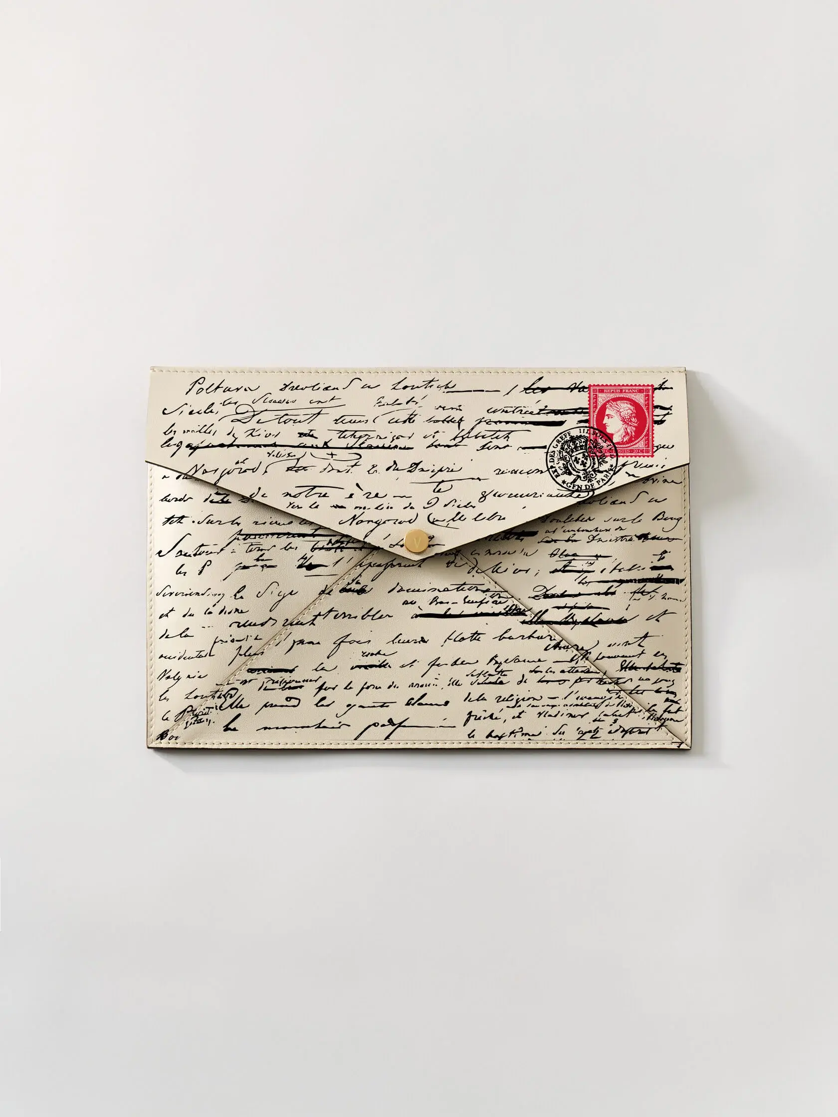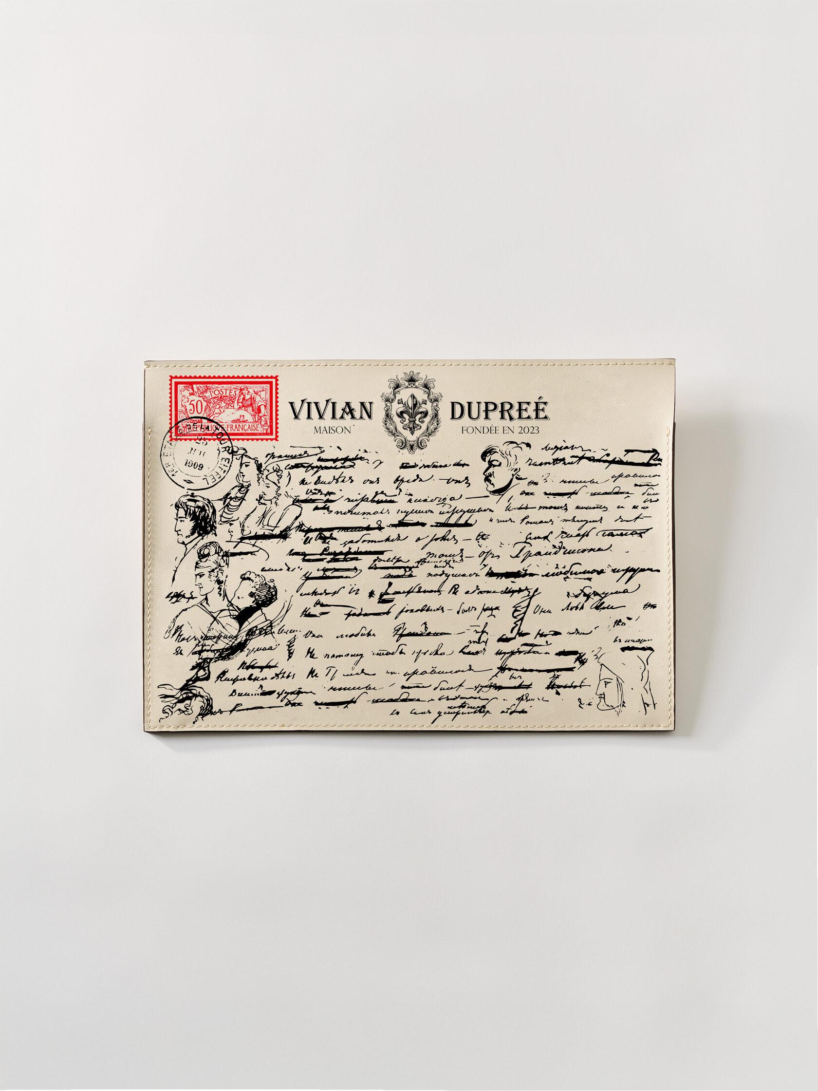 Клатч-конверт, вдохновлённый рукописями знаменитого романа Александра Сергеевича Пушкина «Евгений Онегин». В основе дизайна - фрагменты рукописного письма, силуэты современников поэта и образы эпохи, в которой литература формировалась как личный и смелый акт высказывания. Эти черновики не предназначались для печати, но именно в них раскрывается живая работа мысли, сомнение и свобода автора. Оформление дополнено подлинными почтовыми марками и печатями, создающими ощущение архивного документа, прошедшего время и сохранившего след руки автора. Клатч выполнен из натуральной итальянской кожи с замшевым подкладом, дополнен итальянской фурнитурой. Внутри предусмотрены пять отделений для карт, отдельный карман для паспорта и вместительное пространство для личных вещей. Изделие создано вручную.