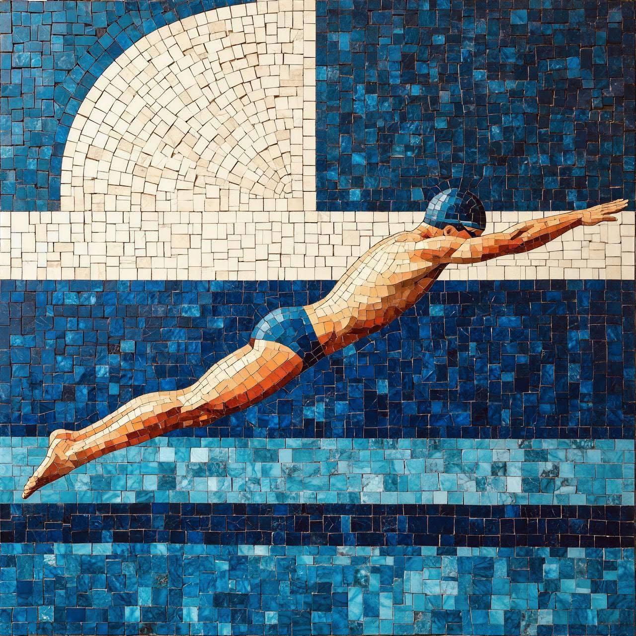 100 х 100 см. Витражное стекло, масло, алюминий. В мозаике №1 я обращаюсь к теме спорта как к философии движения — не как к соревнованию, а как к состоянию человека, который входит в стихию и становится с ней единым целым. Работа выполнена в технике мозаики из витражного стекла — материал здесь важен не меньше сюжета: он даёт свету возможность «двигаться» внутри изображения, усиливая ощущение энергии и глубины.