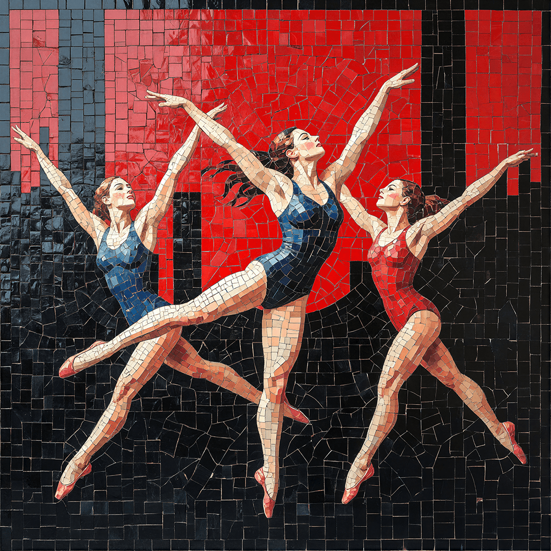 100 х 100 см. Витражное стекло, масло, алюминий. Эта работа посвящена пластике движения и красоте человеческого тела в моменте взлёта. Три женские фигуры, словно застывшие в танце, образуют единую ритмическую композицию, где каждая поза продолжает другую. Это не просто балет или гимнастика — это образ гармонии, силы и внутренней свободы. Красный цвет усиливает ощущение сцены и энергии, превращая пространство в символ внутреннего импульса. Чёрный фон подчёркивает свет тел и делает движение почти скульптурным. Мозаичная техника добавляет работе структурности и одновременно хрупкости — как напоминание о том, что каждое движение состоит из множества маленьких усилий. Для меня эта композиция — о стремлении вверх, о дисциплине, превращённой в искусство, и о той точке, где физическая сила становится эстетикой.