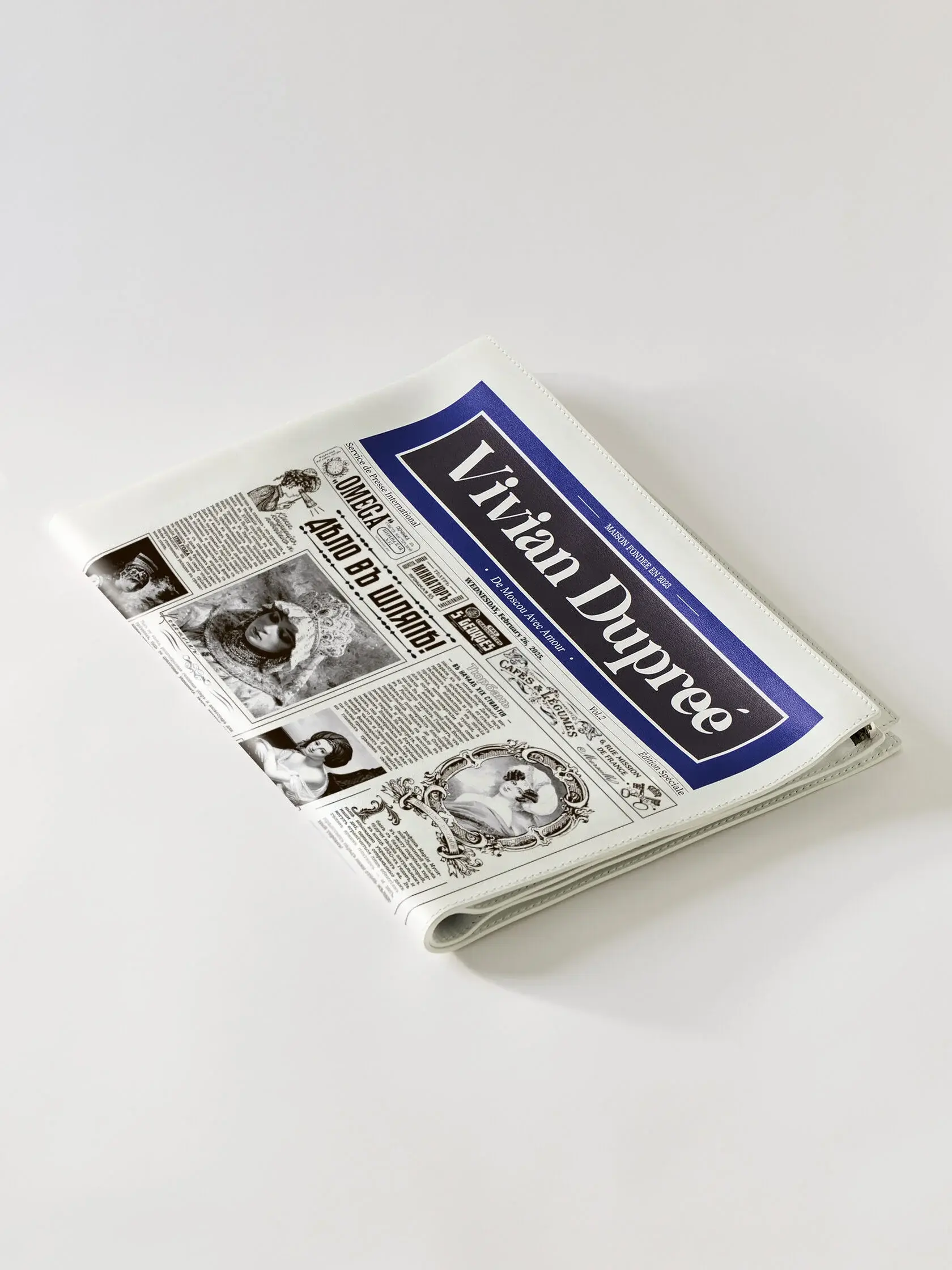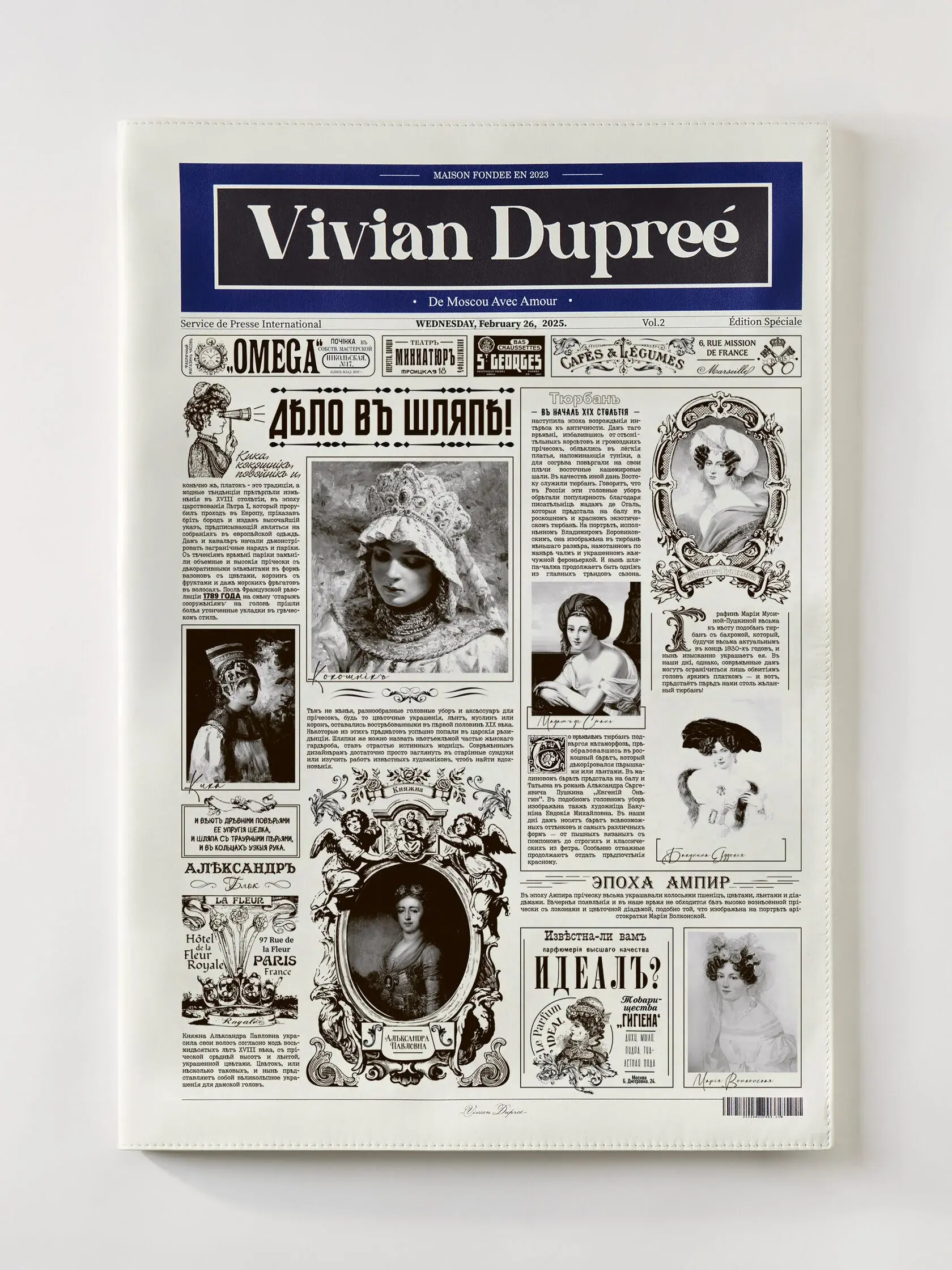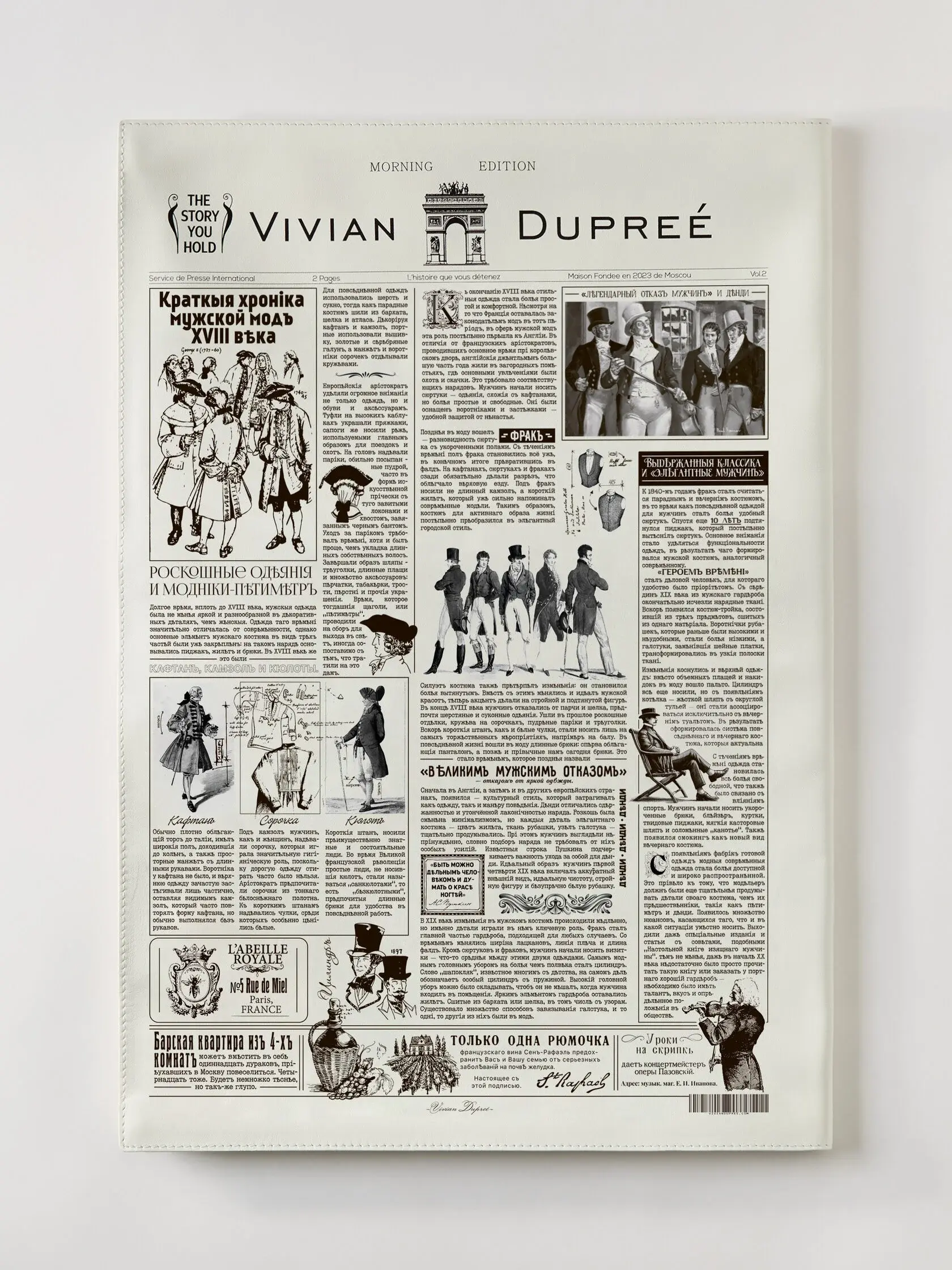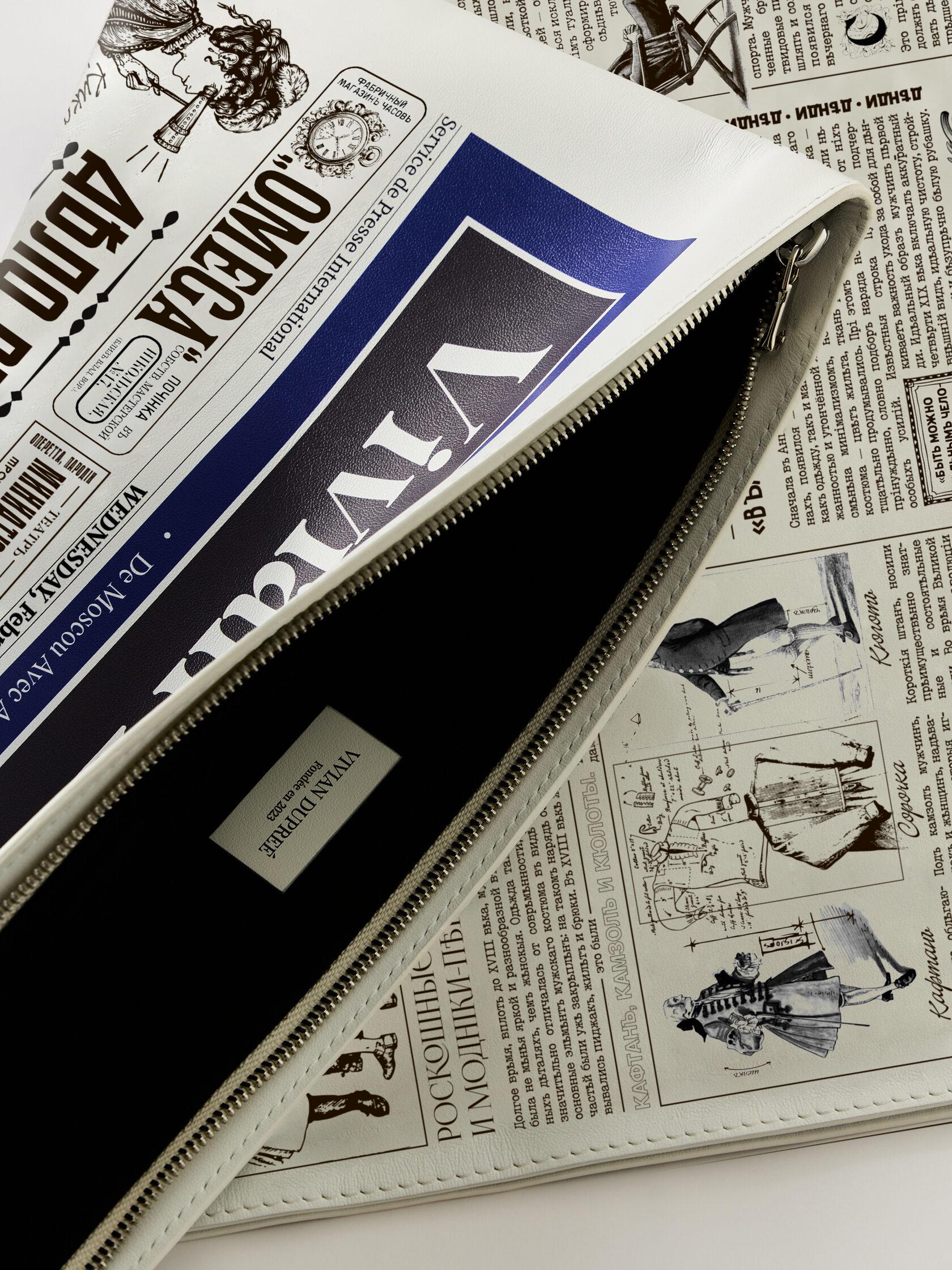 Сумка-газета, стилизованная под номер, посвящённый главным аксессуарам европейской моды ХIХ века – головным уборам. Газета рассказывает о моделях шляп того времени, о мастерах, создающих эти изделия и об ателье, где такие аксессуары можно заказать. Обратная сторона газеты повествует о мужских аксессуарах, главных портных столицы позапрошлого столетия и актуальные на тот момент заведения для господ. Сумка выполнена из натуральной итальянской кожи с замшевым подкладом, дополнена итальянской фурнитурой, покрытой палладием. Сумка создана вручную.