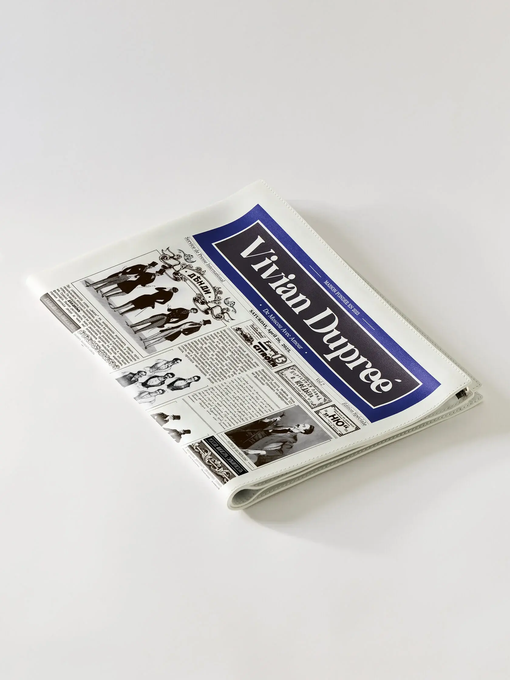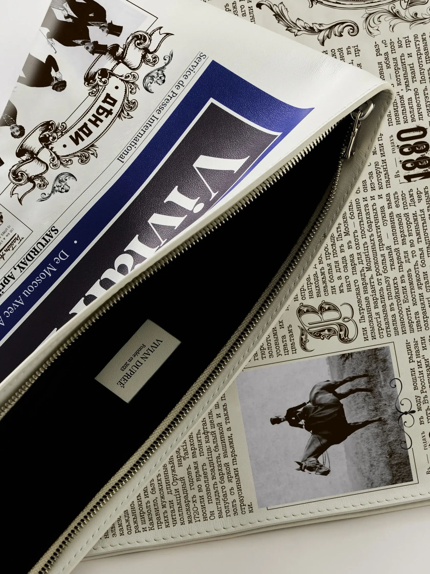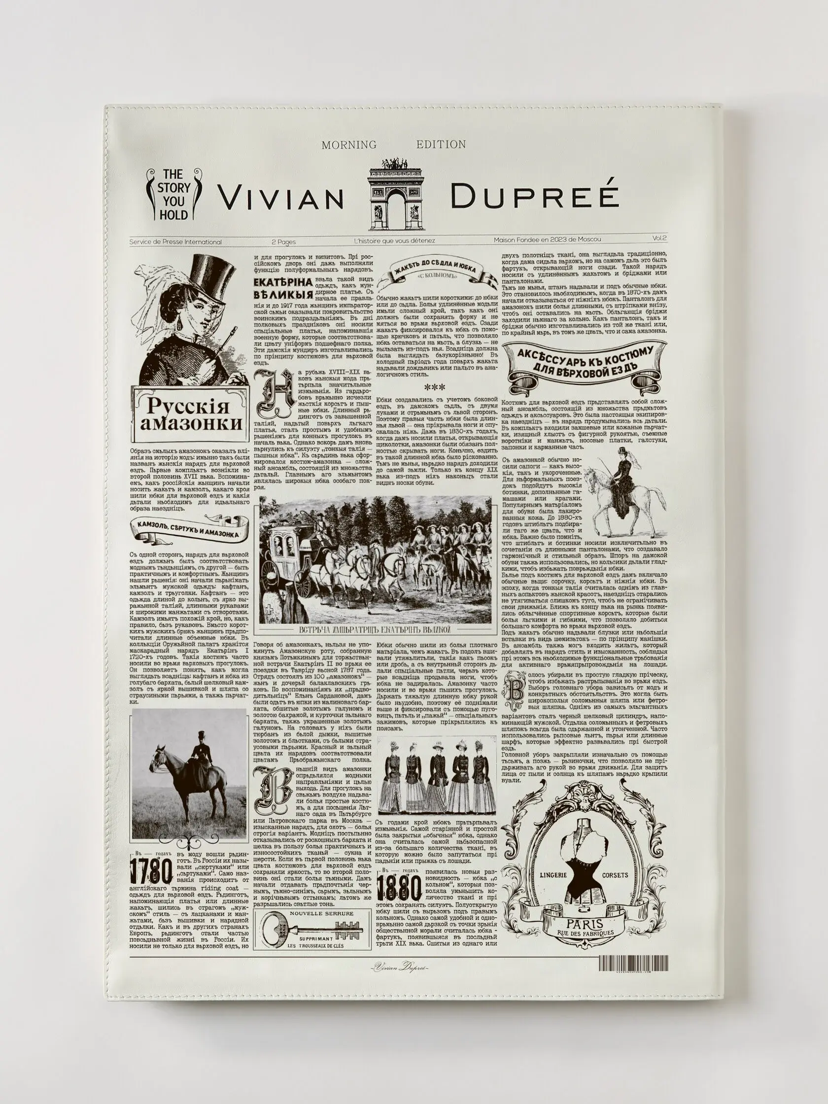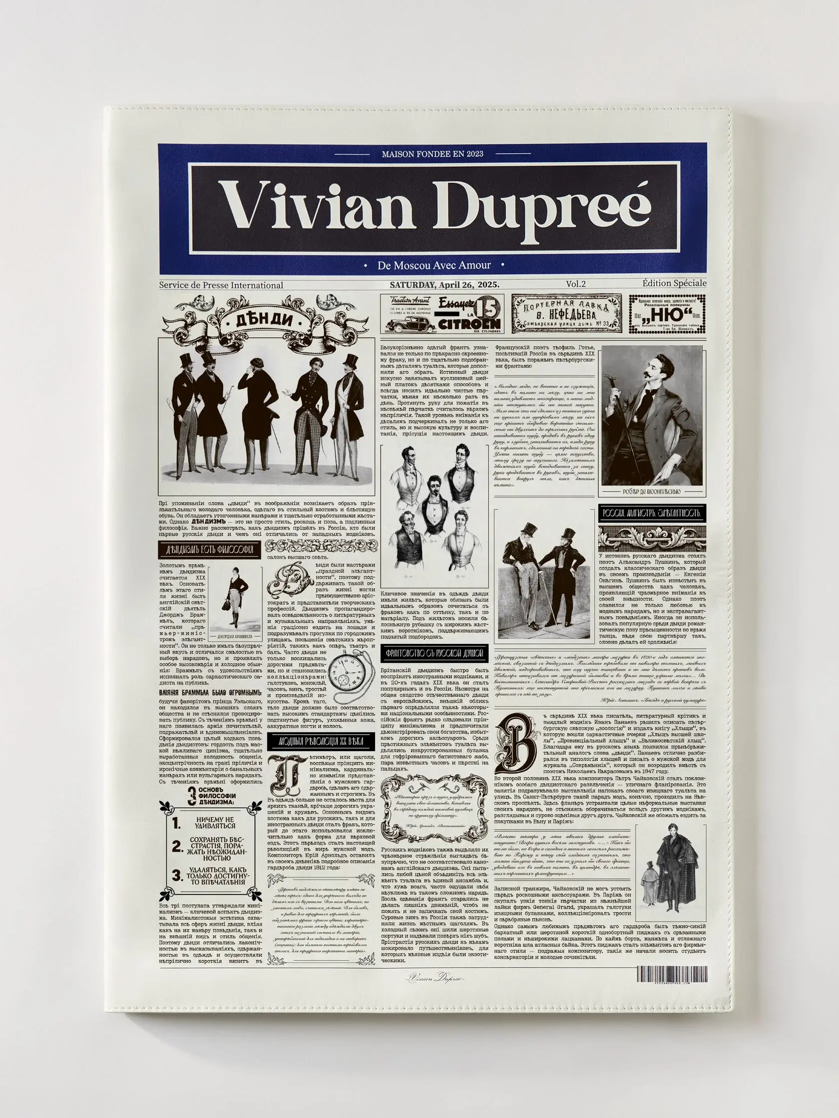 Сумка-газета, стилизованная под номер, посвящённый такому явлению в моде, как дендизм. Газета рассказывает об актуальных новинках этого стиля: жилеты новых фасонов, шляпы-цилиндры, приталенные пальто и свободного кроя брюки. Также газета раскрывает тему образа для верховой езды, и как дендизм повлиял на женскую моду того времени. Сумка выполнена из натуральной итальянской кожи с замшевым подкладом, дополнена итальянской фурнитурой, покрытой палладием. Сумка создана вручную.
