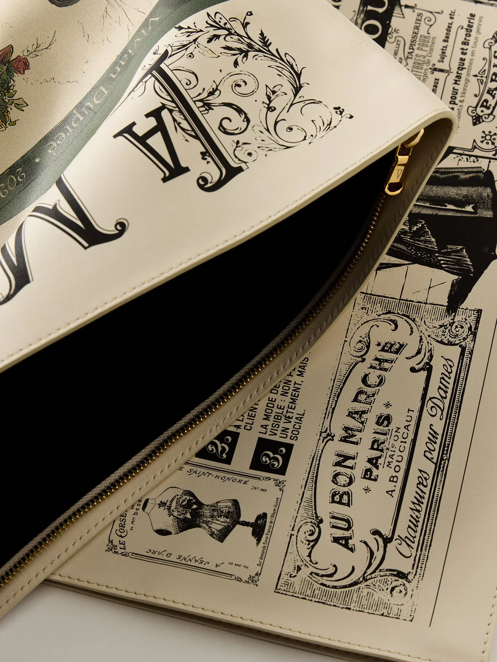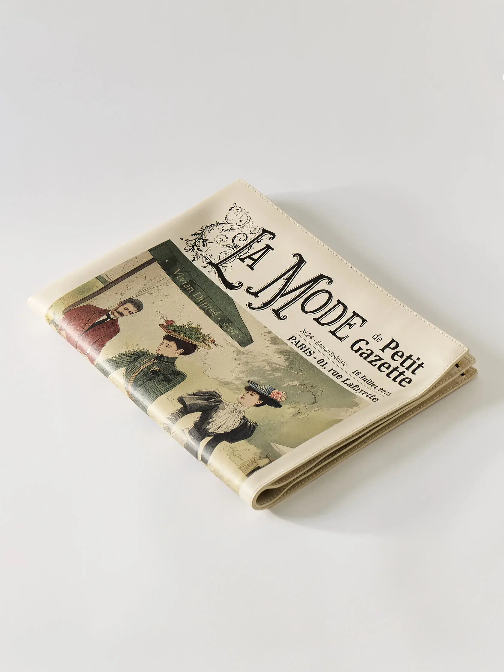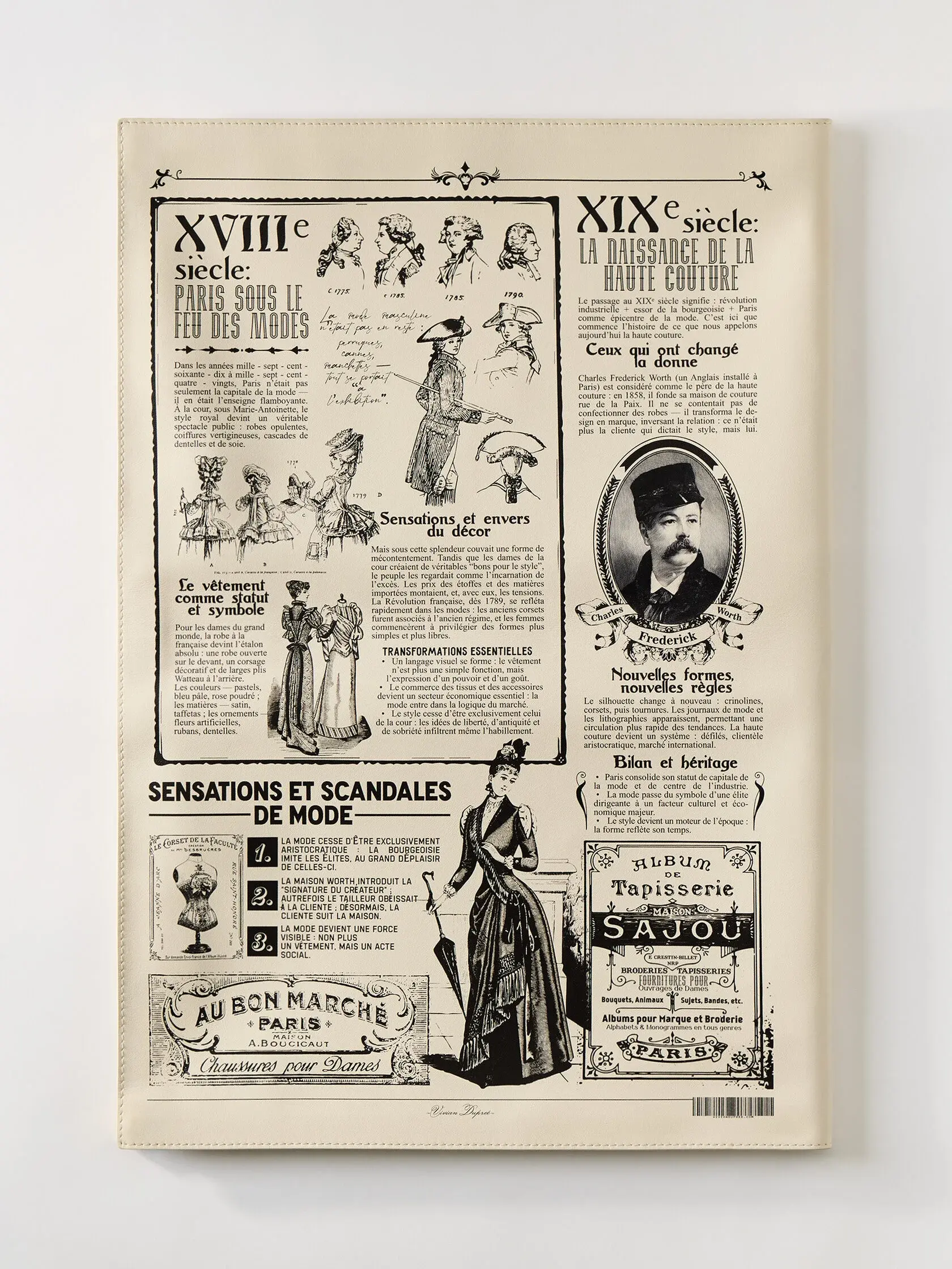 Сумка-газета, стилизованная под номер, посвящённый моде XIX века и становлению Парижа как мировой столицы моды. Газета наполнена иллюстрациями эпохи, хрониками модных силуэтов и архивными рекламными блоками, отражающими рождение Haute Couture и превращение одежды в социальный и культурный символ. В материалах затрагивается влияние Чарльза Фредерика Ворта, формирование модных домов, а также роль рекламы в распространении новых форм, вкусов и представлений о статусе. Сумка выполнена из натуральной итальянской кожи с замшевым подкладом, дополнена итальянской фурнитурой, покрытой палладием. Сумка создана вручную.