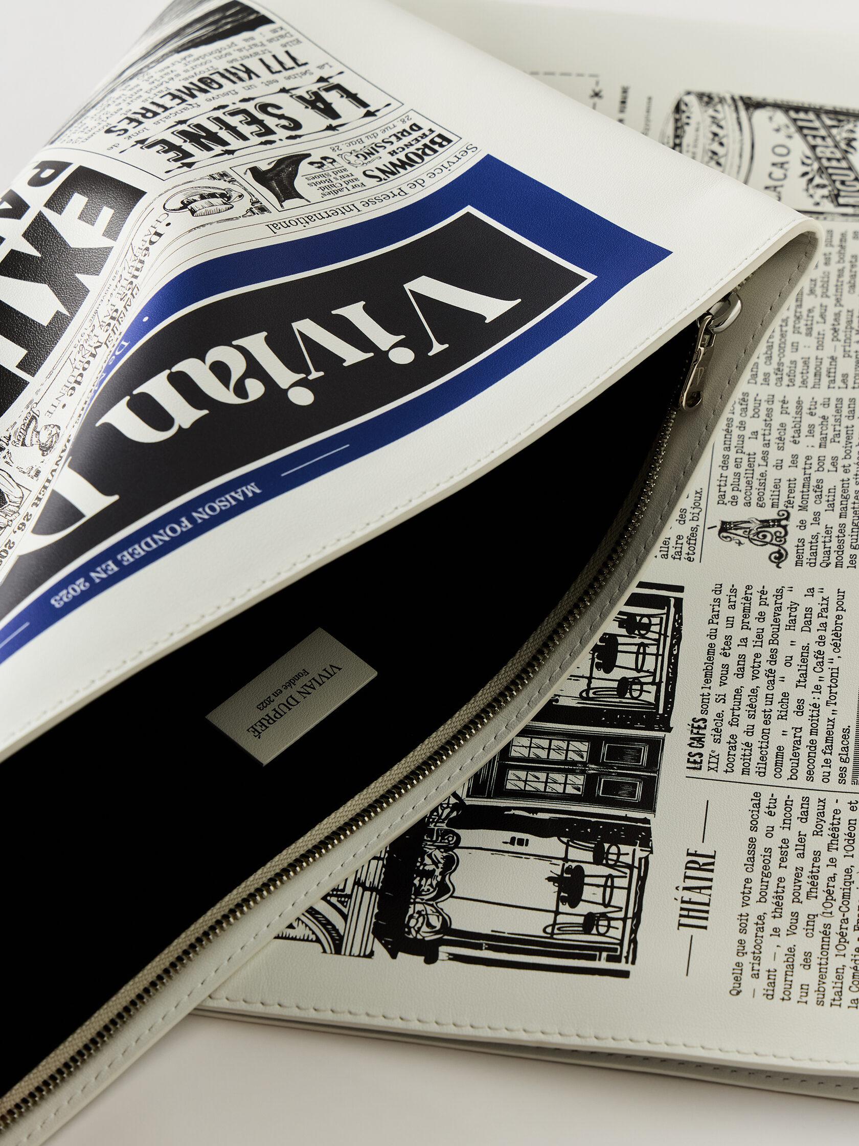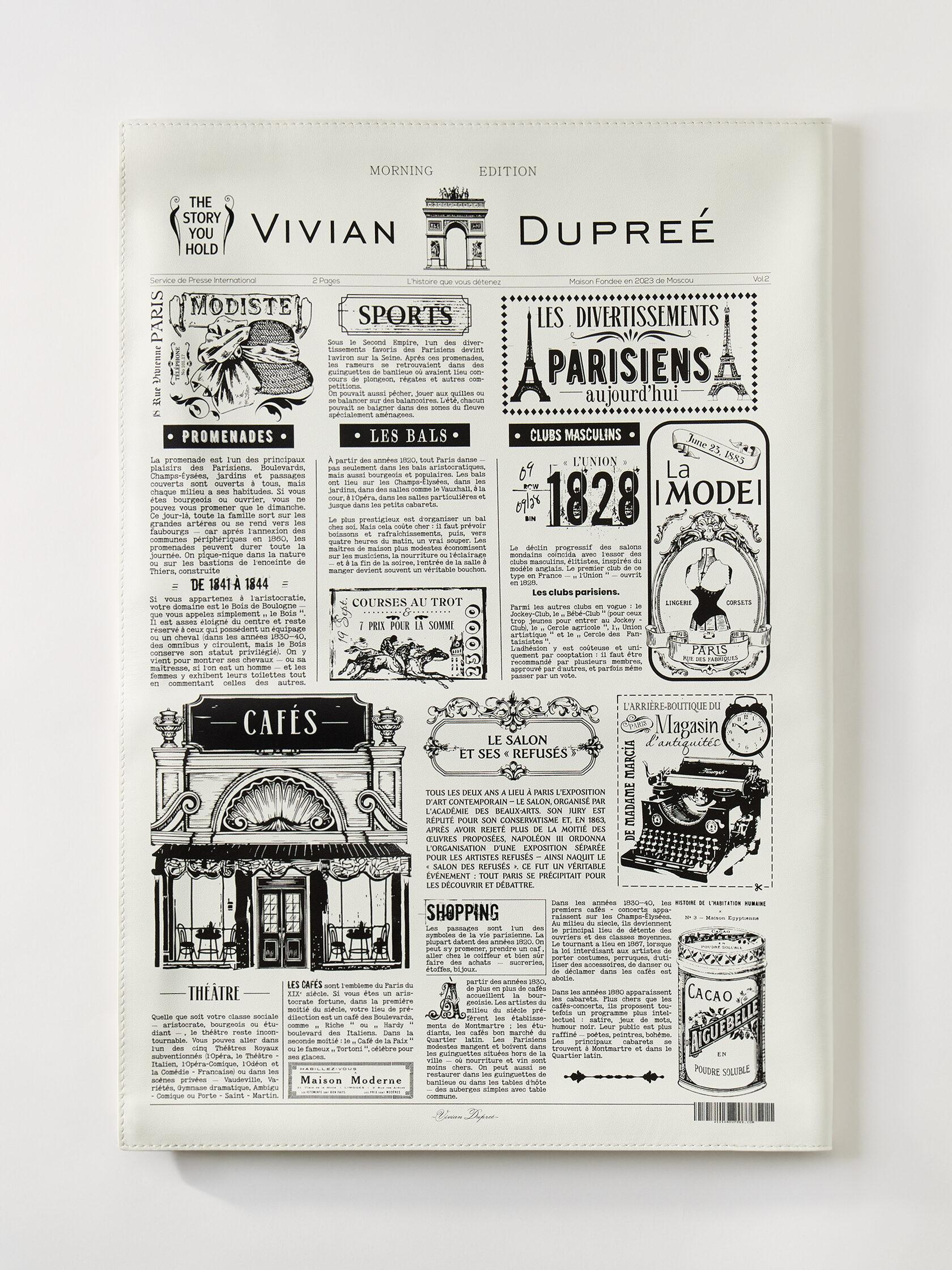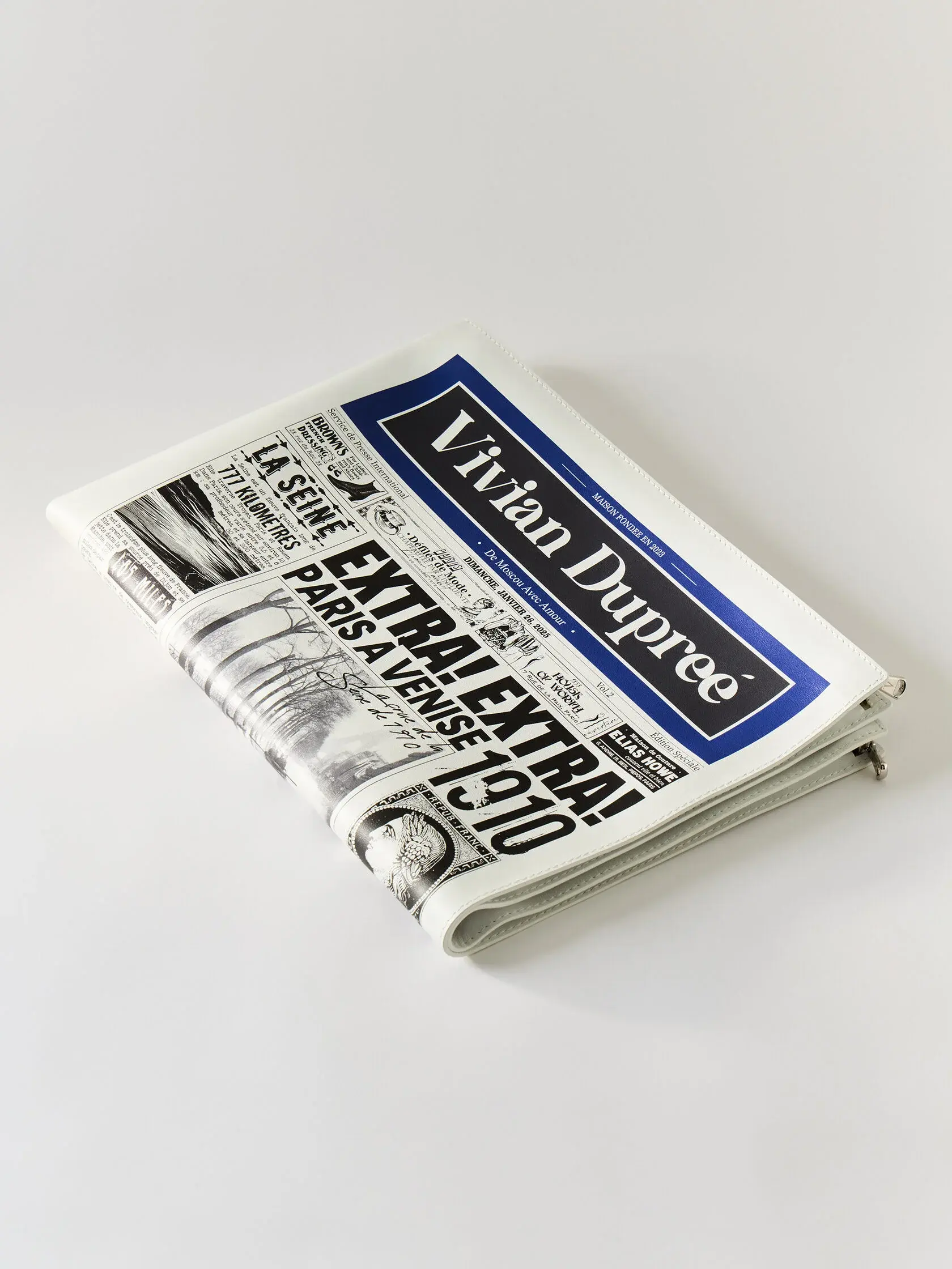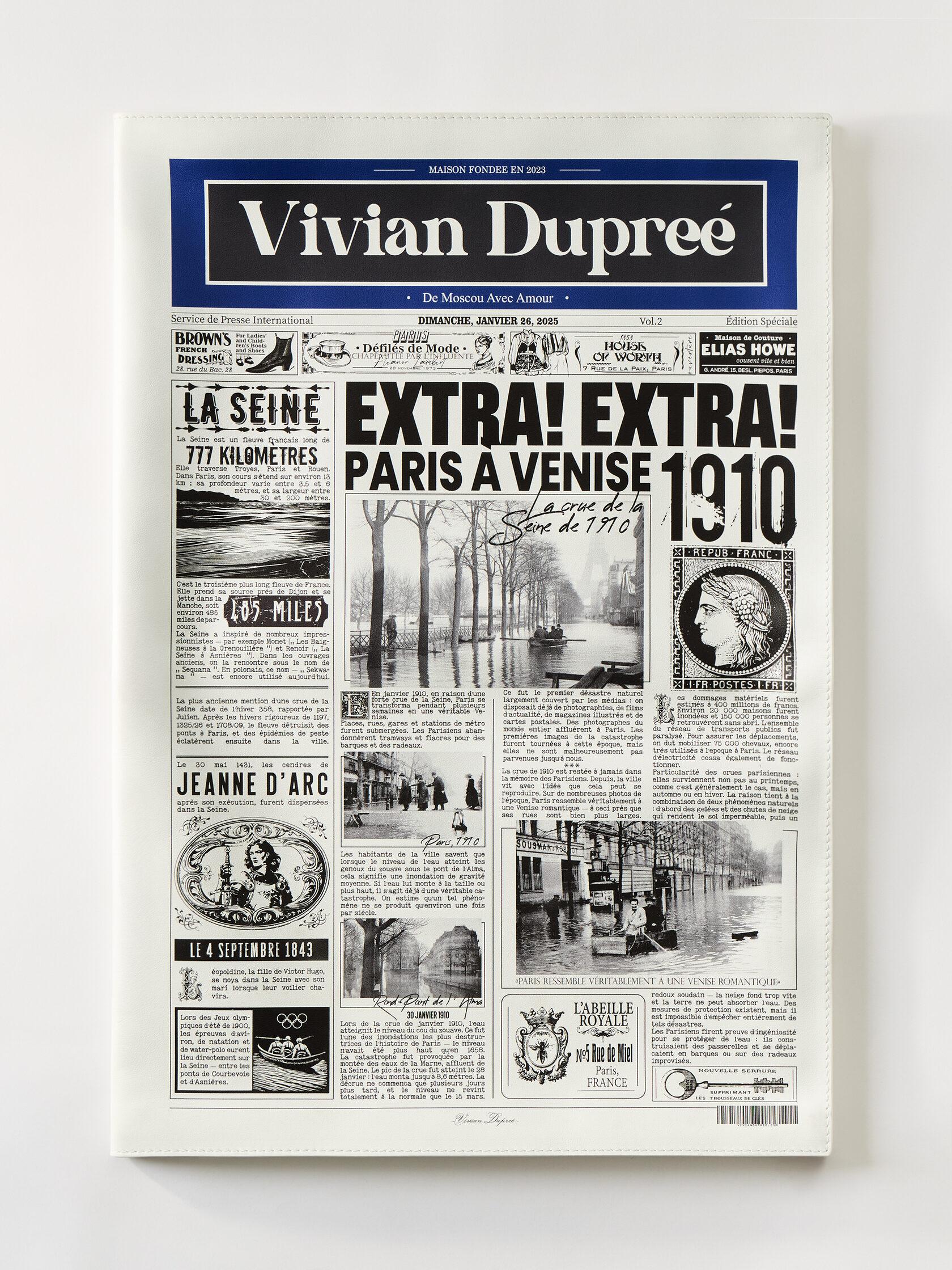 Сумка-газета, стилизованная под номер, посвящённый наводнению в Париже 1910 года - событию, вошедшему в историю как момент, когда город оказался во власти Сены и был подобен Венеции. Газета наполнена архивными статьями и фотографиями, рассказывающими о разливе реки, затопленных улицах и повседневной жизни парижан в дни стихии. В материале также присутствуют отсылки к Сене как символу города и небольшие исторические упоминания об исторических личностях, неразрывно связанных с образом Парижа. Сумка выполнена из натуральной итальянской кожи с замшевым подкладом, дополнена итальянской фурнитурой, покрытой палладием. Сумка создана вручную.