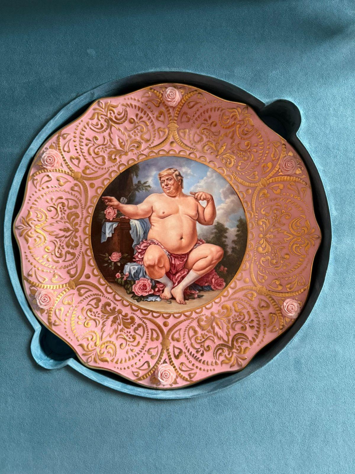 Диаметр - 30 см Ручная роспись В эпоху цифрового шума настоящая роскошь — это артефакт, несущий на себе отпечаток человеческих рук и уникального, даже эксцентричного замысла. Именно таким сокровищем является эта фарфоровая тарелка — единственный и неповторимый плод шестимесячного труда Авдотьи, пожилой художницы из глубинки Архангельской области. Обычно она пишет лики святых на дереве и фарфоре для местных храмов, но на сей раз вдохновилась фигурой Дональда Трампа, каким его рисуют российские государственные СМИ. Результат — поразительная аллегория в духе барокко: Трамп-Бахус, окруженный розами из костяного фарфора, словно сошедший с плафона какого-нибудь палаццо, но рожденный в северной деревне. Это не просто сувенир; это квинтэссенция народного мифотворчества, материализованная в изысканной технике, обычно reserved для икон и императорских сервизов. Шанс приобрести такой объект — единственный и неповторимый.